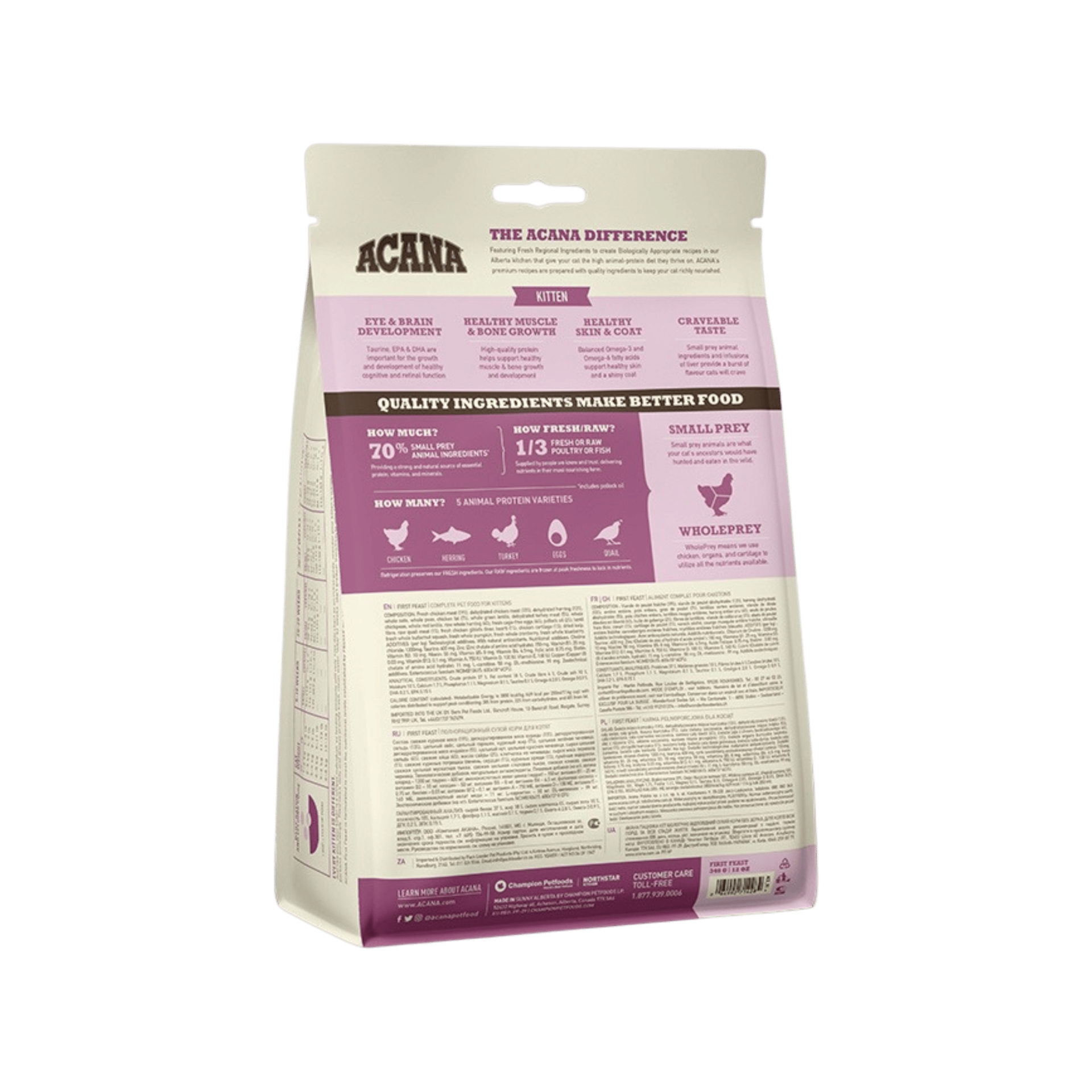 Vykročte do života svého kotěte s jídlem plným ingrediencemi z celých zvířat. ACANA FIRST FEAST je vytvořena tak, aby poskytovala vše, co vaše kotě potřebuje pro špičkový růst a vývoj. Je plné volně chovaného kuřete a celých sleďů v poměru celé kořisti (maso, orgány, chrupavky a kosti) a poskytuje tak vašemu kotěti vše co přirozeně potřebuje. Krmivo ACANA FIRST FEAST má nejlepší předpoklady k tomu, aby udrželo vaši kočku zdravou a šťastnou.