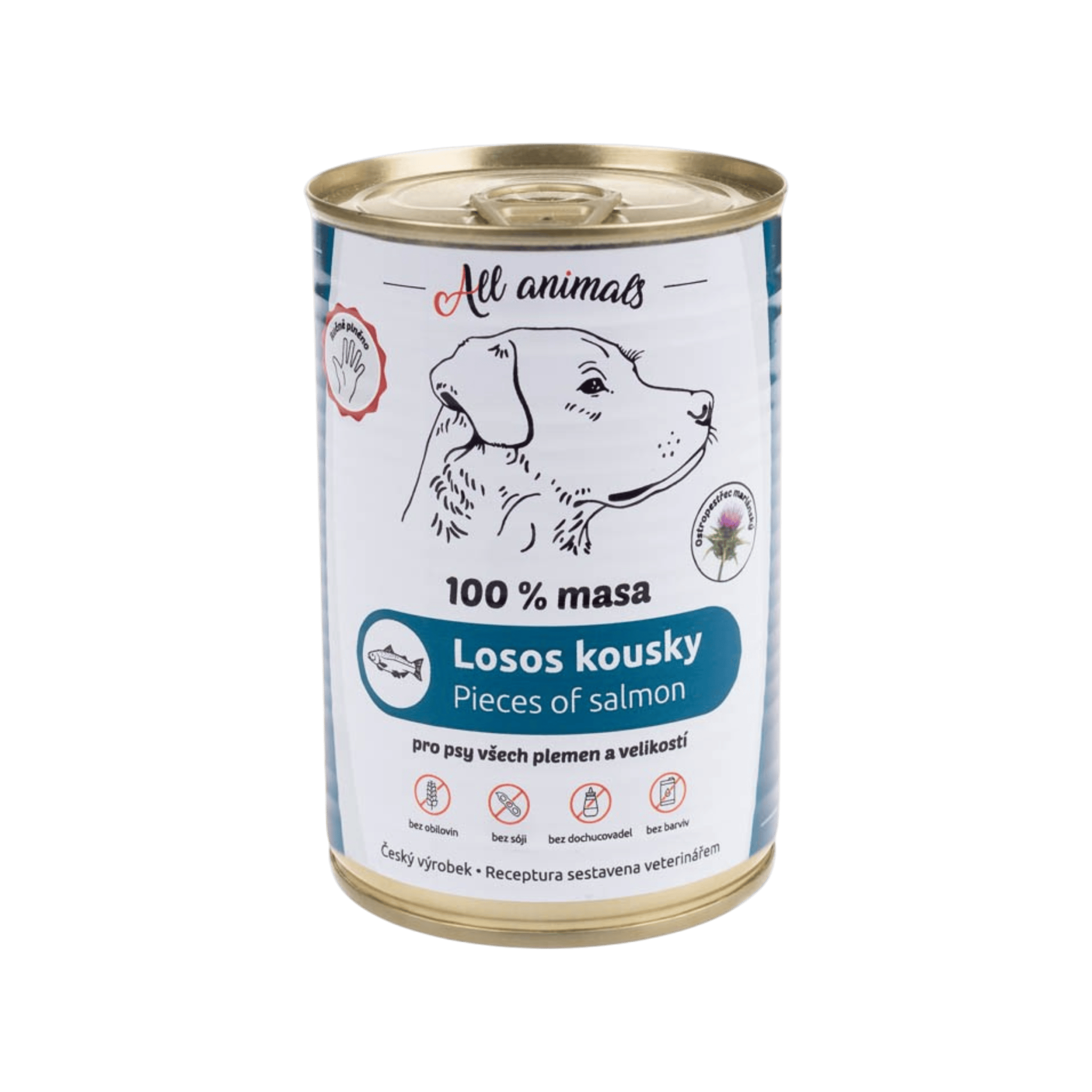 Luxusní 100% masová konzerva pro psy, s příchutí kousky lososa.