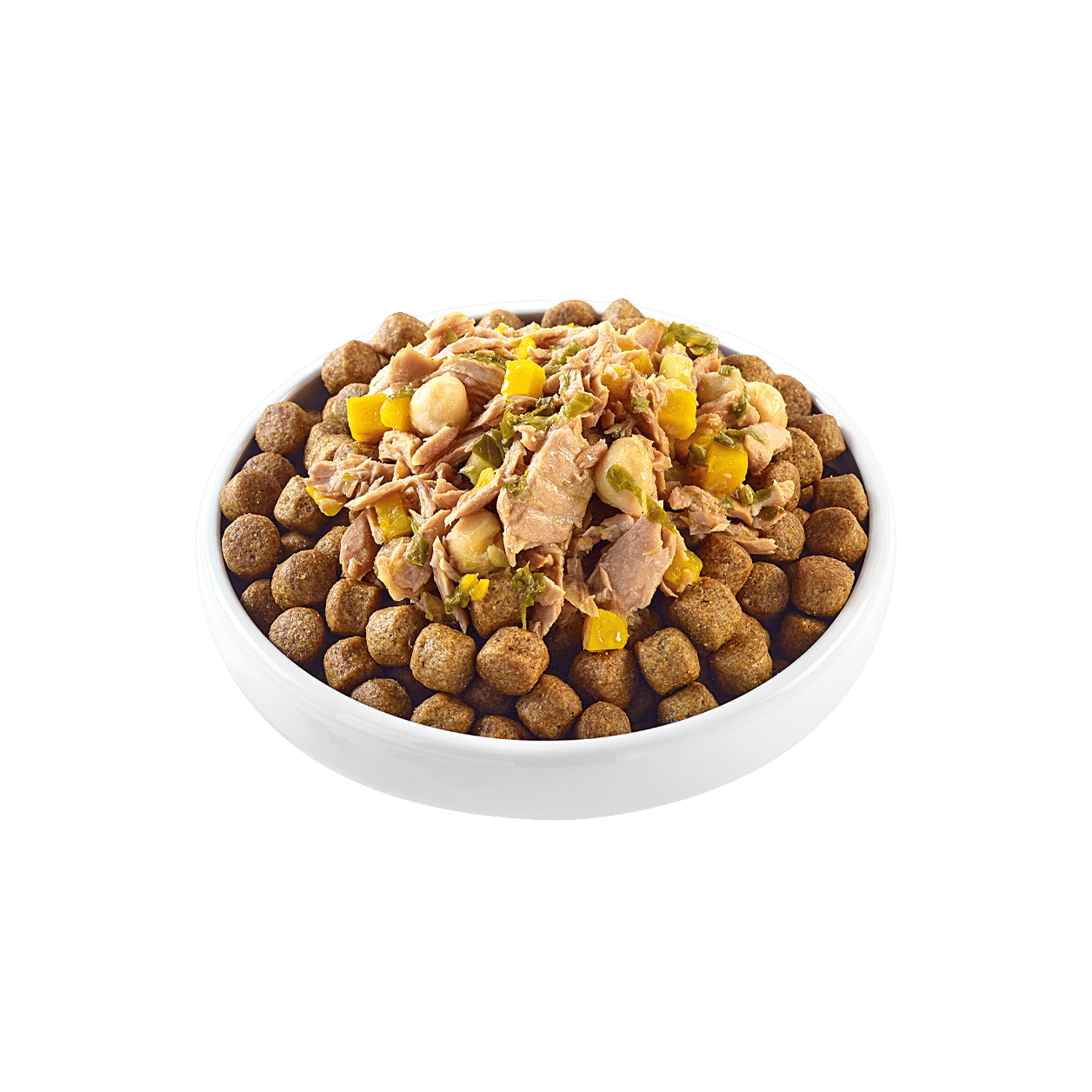 Filet z tuňáka 45%, rybí vývar, dýně 10%, cizrna 10%, kapusta 5%.