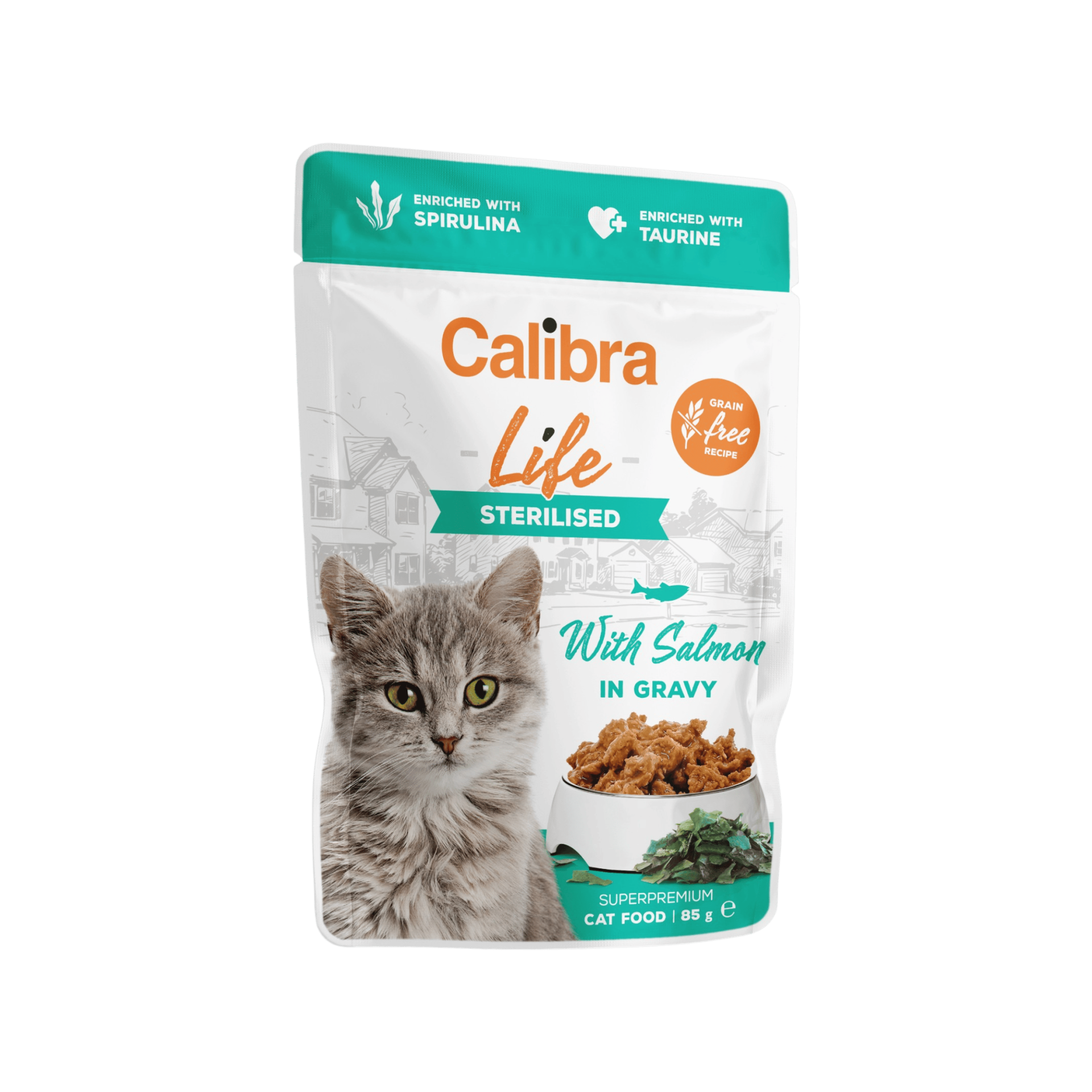 Receptura s lososem masové kapsičky pro dospělé kastrované a sterilizované kočky obsahuje vysoké množství masa 76 % ve filetech v omáčce. Neobsahuje obiloviny. Vysoká chutnost a skvělá stravitelnost je zajištěna i díky složení jedině z kvalitních surovin. Doplněno o chytrá funkční aditiva podle určení receptury, a to včetně nezbytného taurinu. Obohaceno navíc o spirulinu s příznivým vlivem na organismus kočky. Kompletní superprémiové vlhké krmivo je určeno pro dlouhodobé krmení.