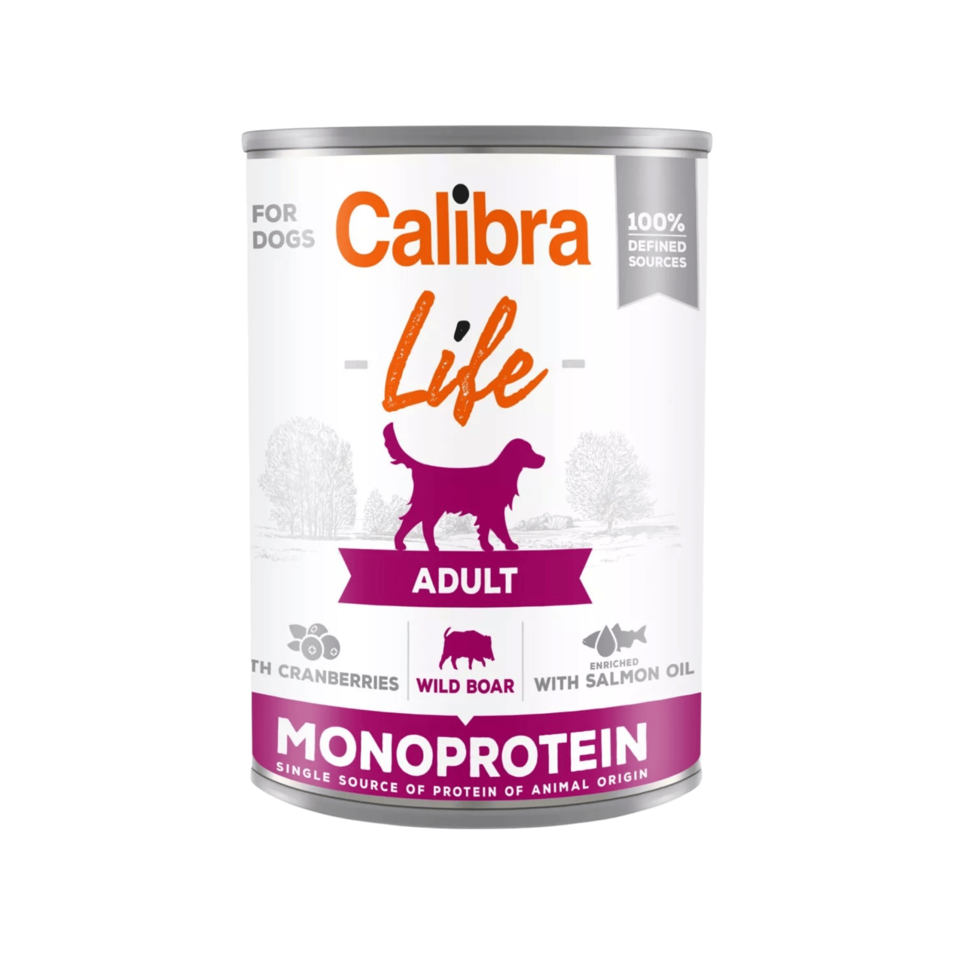 Calibra Dog Life Adult Wild Boar with Cranberries - receptura konzervy s kančím a brusinkami je kompletním krmivem, které je určené pro dospělé psy.
