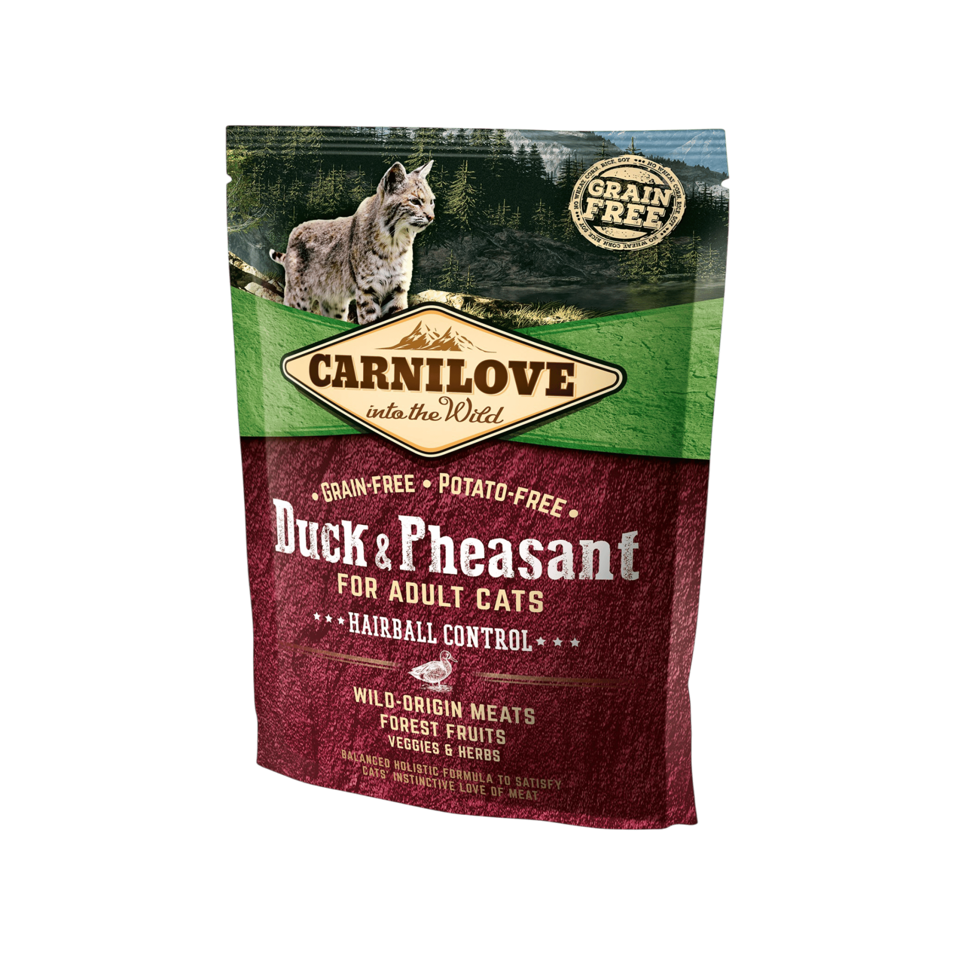 Holistické vysoce kvalitní krmivo z kachny a bažanta, bez obilovin a bez brambor pro perfektní kondici dospělých koček. Obohaceno o přírodní vlákninu z cukrové řepy pro prevenci tvorby chlupových chomáčků, maso z divokých zvířat, lesní ovoce, zelenina a byliny.