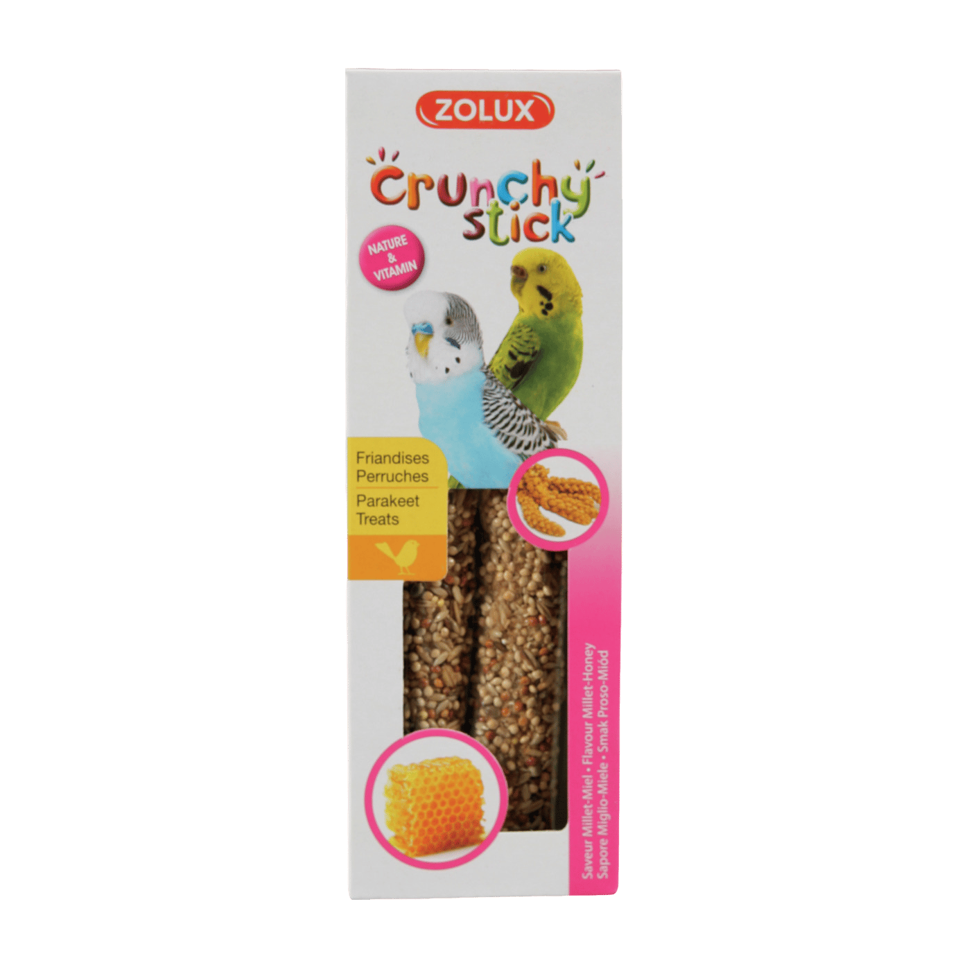 Doplňkové krmivo pro domácí ptactvo. Křupavé tyčinky jsou vyrobeny z přírodních surovin s vitamíny, neobsahují žádná barviva, konzervační látky ani žádné přidané cukry a přirozeně udržují zdravý zobák.