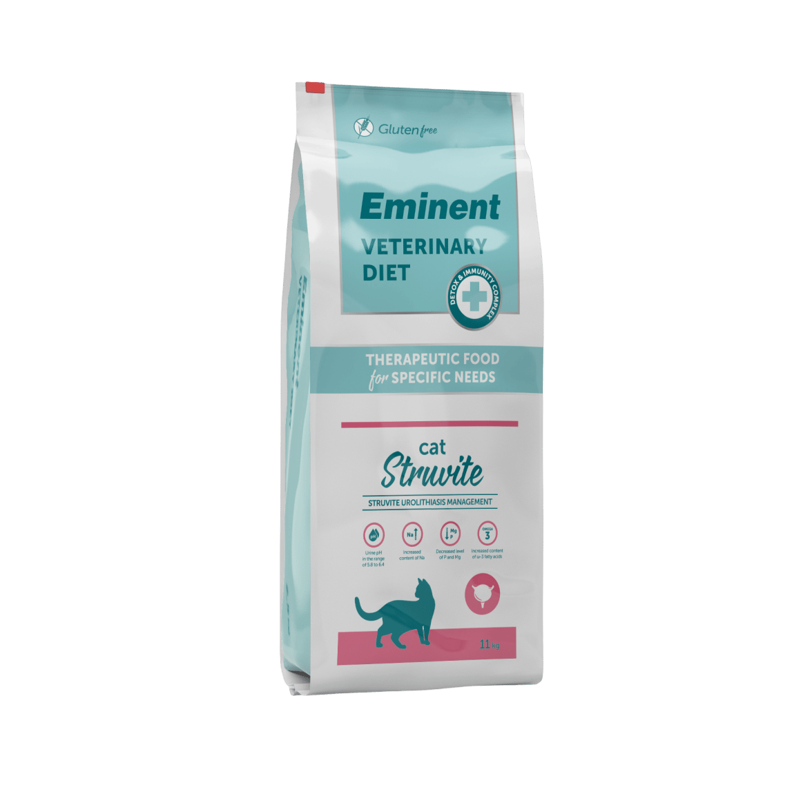 Tyto speciální požadavky splňuje kompletní krmivo EMINENT VETERINARY DIET CAT STRUVITE. Jednou z funkčních složek tohoto krmiva jsou brusinky, které obsahují proantokyanidiny. Tyto látky mají schopnost zastavit ulpívání bakterií na stěnách močového měchýře a vytváření kolonií, čímž brání bakteriálním infekcím celého vylučovacího systému.