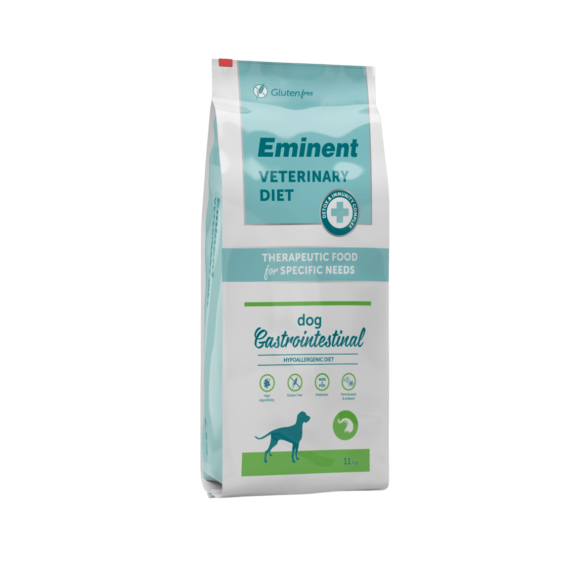 Receptura krmiva Eminent Diet Dog Gastrointestinal/ Hypoallergenic je založena je založena na kachním masu obohaceném o hydrolyzovaný lososový protein, jehož částice jsou tak malé, že nejsou schopny vyvolat alergickou reakci, a navíc jsou vysoce stravitelné. Toto krmivo obsahuje funkční složky jako například plody fenyklu a anýzu, které mají příznivý účinek na gastrointestinální trakt a hladké trávení.