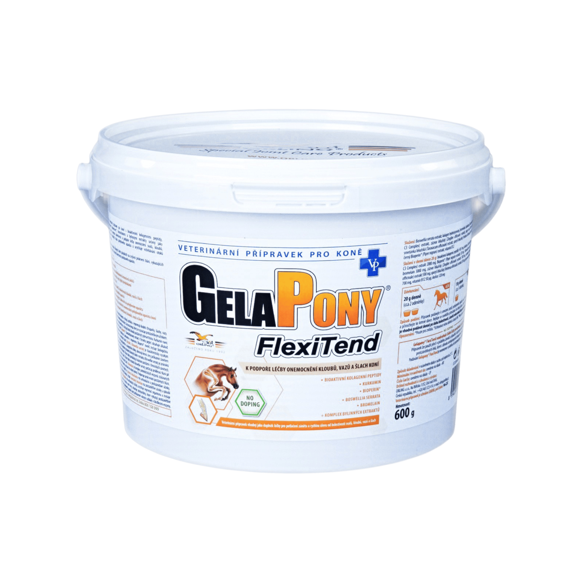Gelapony® FlexiTend je veterinární přípravek pro koně s bioaktivními kolagenními peptidy, Boswellií serratou, kurkuminem, Bioperinem®, bromelainem a bylinnými extrakty určený jako doplněk léčby k potlačení zánětu, omezení bolestivosti a podpoře léčby onemocnění svalů, kloubů, vazů a šlach. Zvyšuje prokrvení měkkých tkání pohybového aparátu a urychluje vstřebávání otoků po práci, transportu či delším stání. Gelapony® FlexiTend obsahuje komplex účinných látek působících na zvýšení prokrvení tkání, vykazujících protizánětlivé účinky a napomáhajících k snížení bolestivosti pohybového aparátu.
