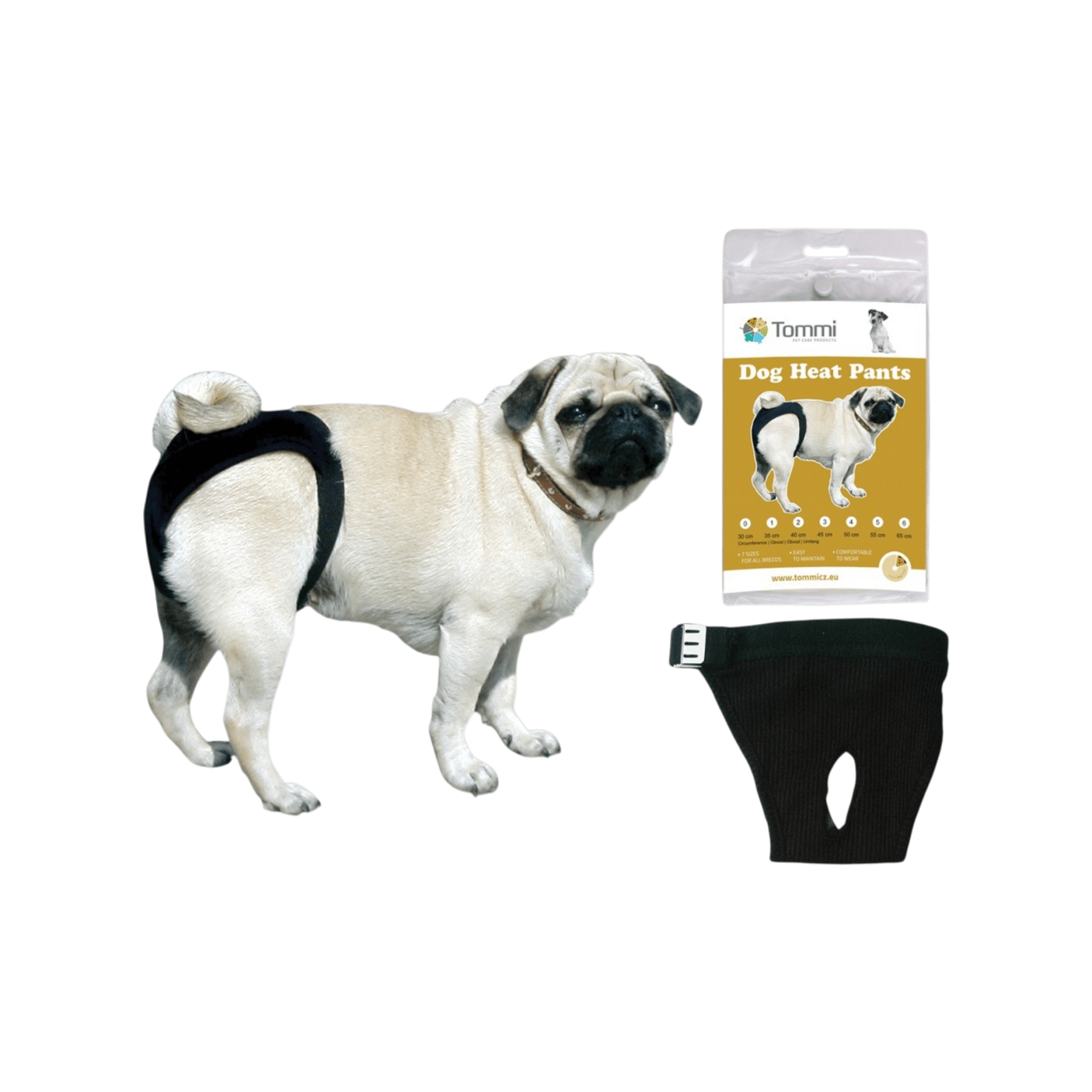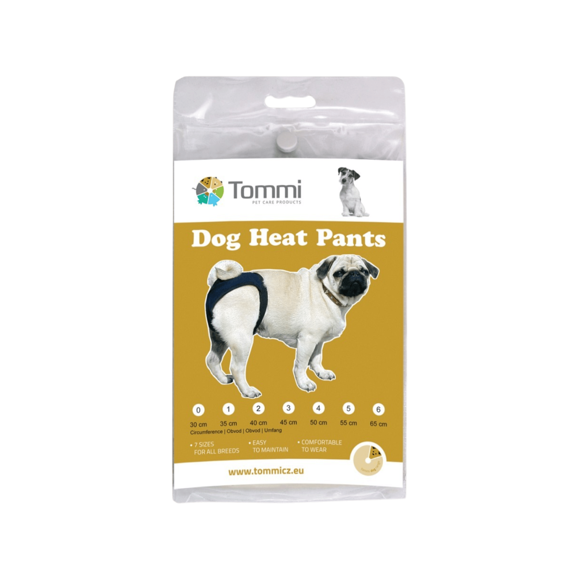 Materiál kalhotek je zvolený pro časté ruční praní. Kalhotky nesmí fenu obtěžovat, proto je obvodový lem pružný, zapíná se na kovovou sponu. Jen správná velikost kalhotek zajistí jejich funkčnost.