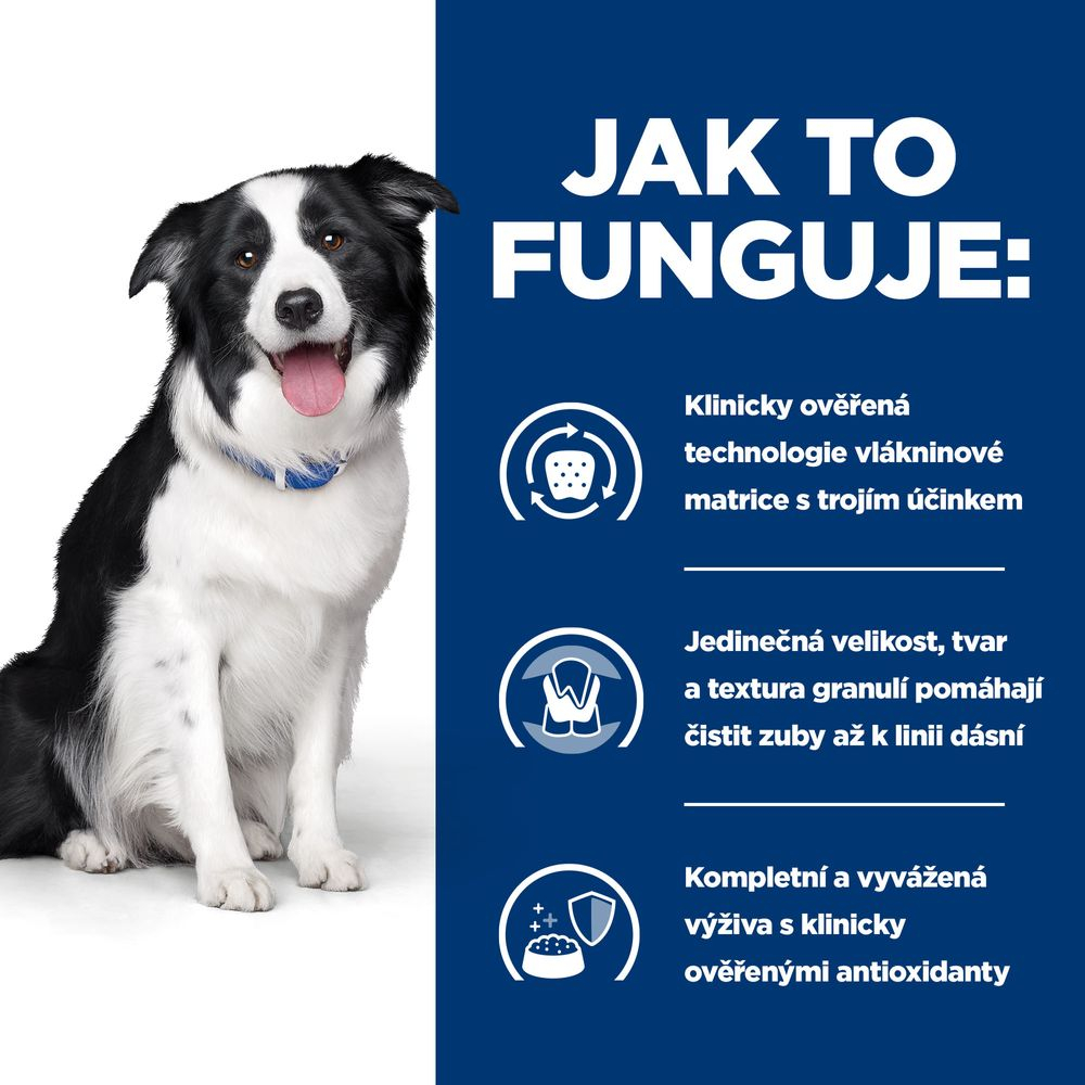 Granule obsahuje klinicky ověřené uspořádání vláken s trojím účinkem, které odstraňuje plak, skvrny i zubní kámen. Speciální uspořádání vláken čistí zuby a odstraňuje plak, čímž přispívá k čerstvému dechu. Velká velikost, tvar a struktura granulí čistí zuby až po linii dásní a podporují tak zdravé dásně a zuby. Bylo ověřeno, že výlučné podávání Hill's Prescription Diet t/d suchého krmiva pro psy je účinnější než čištění zubů kartáčkem vzhledem ke skutečnosti, že pouze málo majitelů čistí svým psům zuby pravidelně. Odborníci na výživu a veterináři společnosti Hill's vyvinuli klinickou výživu Prescription Diet t/d na podporu zdravých dásní a zubů i celkového zdraví vašeho psa.