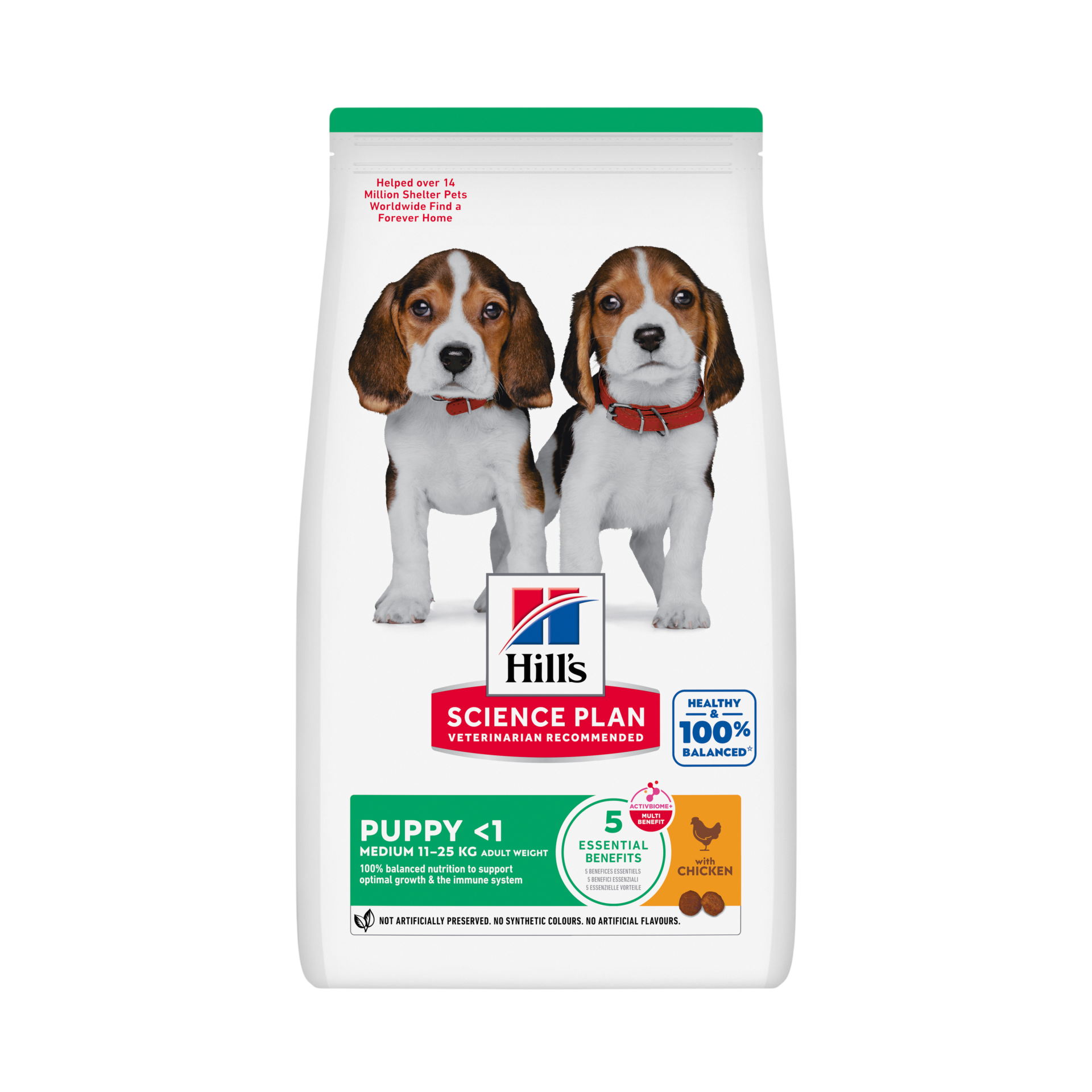 Prémiové suché krmivo pro štěňata středních plemen s lahodným kuřetem a pěti benefity pro optimální růst a vývoj.