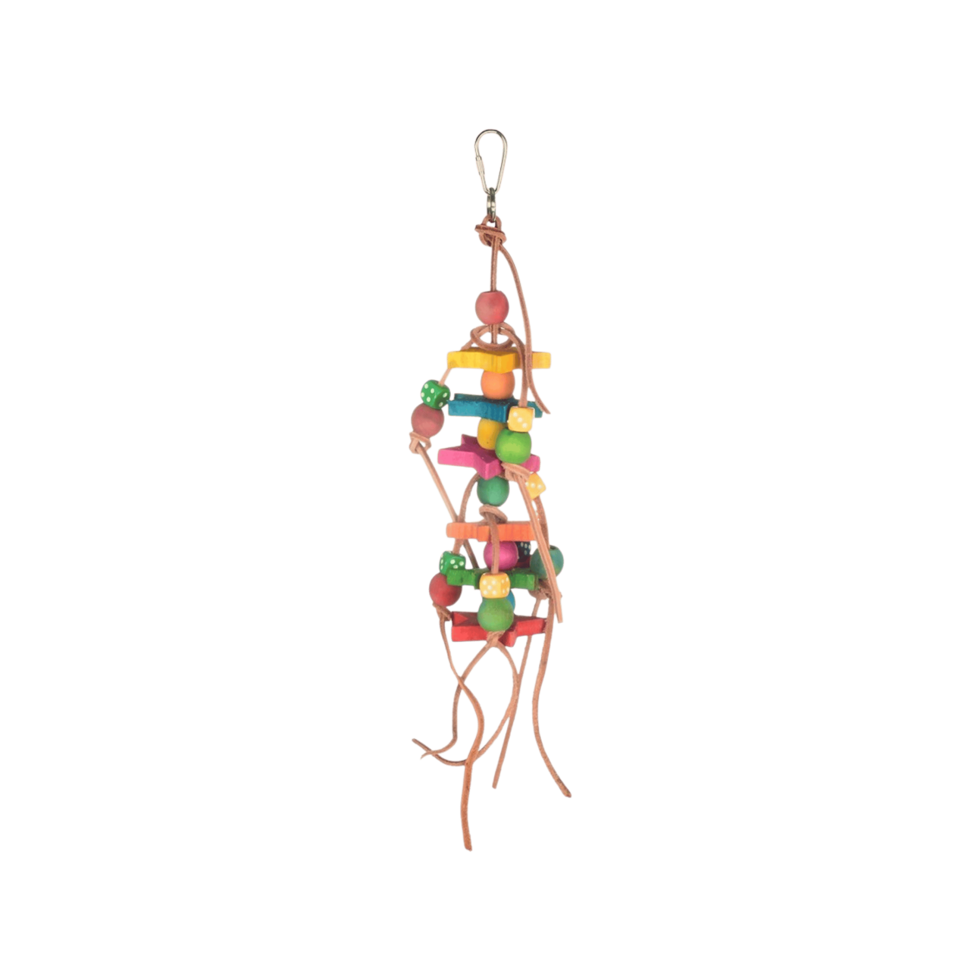 Dřevěná hračka s korálky, kostkami a hvězdami, která je vhodná pro malé, střední a velké exoty.