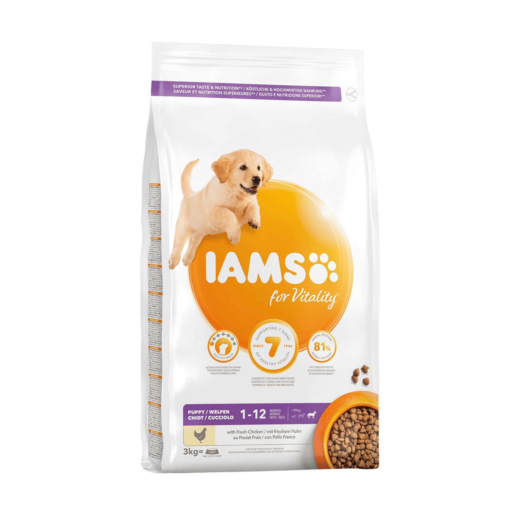 Krmivo IAMS for Vitality pro štěňata velkých plemen je 100% kompletní a vyvážené odborníky sestavené krmivo, které bude vašemu štěněti svědčit. Naše nová a vylepšená receptura pro štěňata s čerstvým kuřecím masem je založena na kvalitních živočišných bílkovinách, které byly pečlivě vybrány, aby podporovaly sedm znaků zdravé vitality štěněte.Aby byla štěňata zdravá, aktivní a plná energie, obsahují naše lahodné receptury až 81 % živočišných bílkovin z kuřecího masa (z celkového obsahu bílkovin).