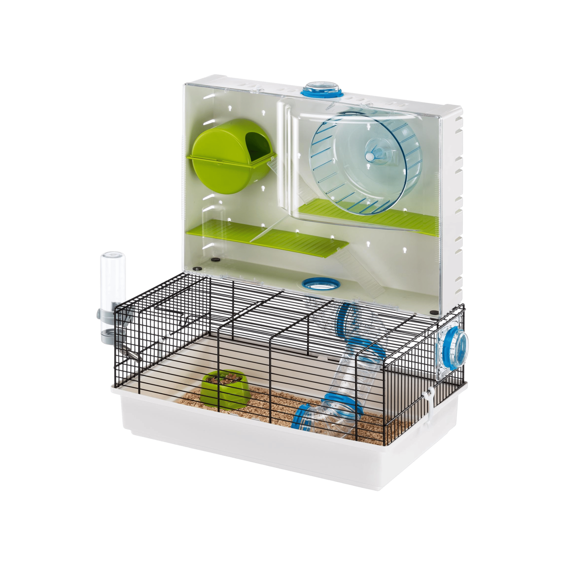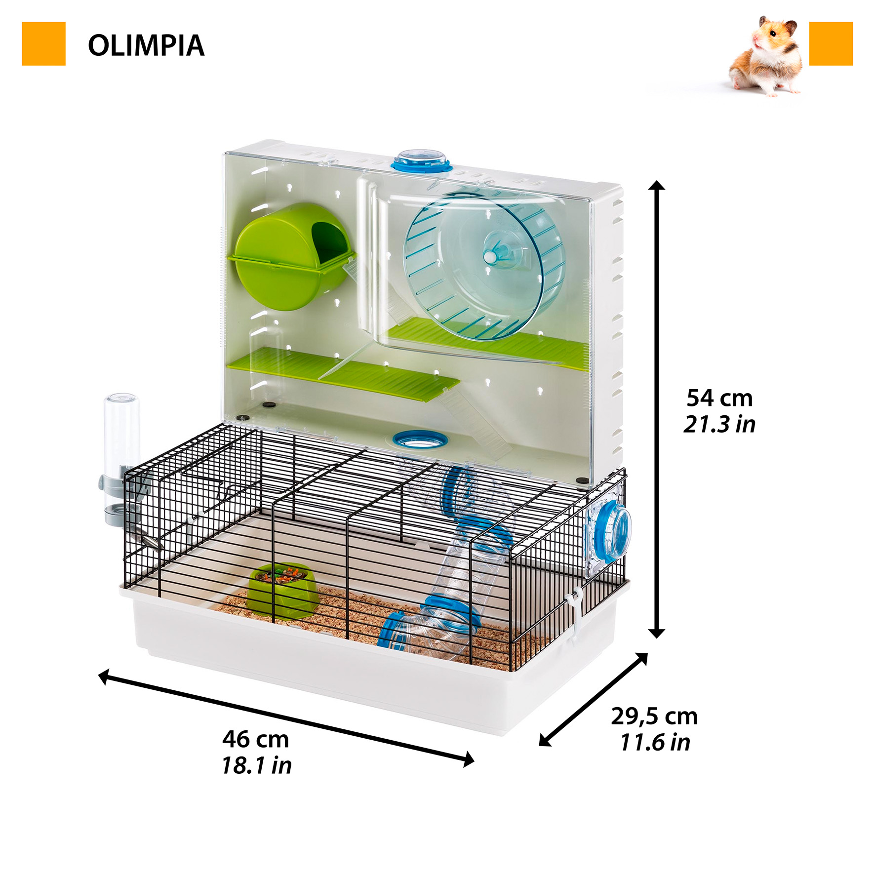 Pokud je váš hlodavec stále v pohybu, rád si hraje a nikdy nezůstává v klidu, pak je pro něj klec pro křečka Olimpia ideální. Toto stanoviště nabízí dostatek prostoru, ve kterém si vaši roztomilí přátelé mohou volně hrát. Jeho konstrukci tvoří klasická drátěná klec a speciální vertikální část pokrytá průhledným plastem, ve které jsou cestičky s kolečkem, domeček, police a žebříky, vše pro rekreaci a cvičení. Ve spodní části klece naleznete také užitečné příslušenství včetně láhve na pití a plastové misky na jídlo.