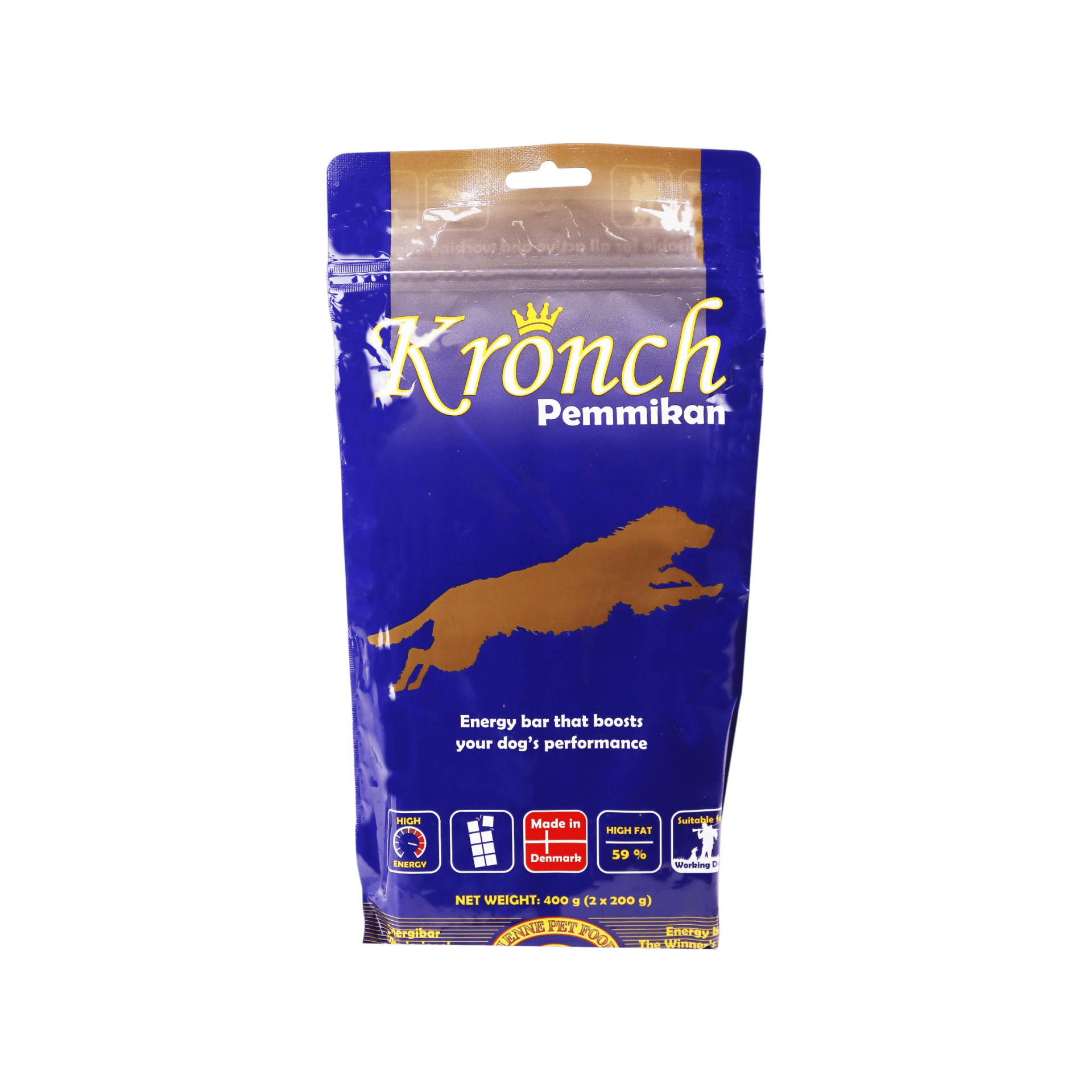 Kronch Pemmikan je energetický blok pro psy, kteří opravdu potřebují pracovat nebo potřebují z jiných důvodů koncentrovanou energetickou podporu. Je vhodný i pro psy v rekonvalescenci nebo pro březí či kojící feny.