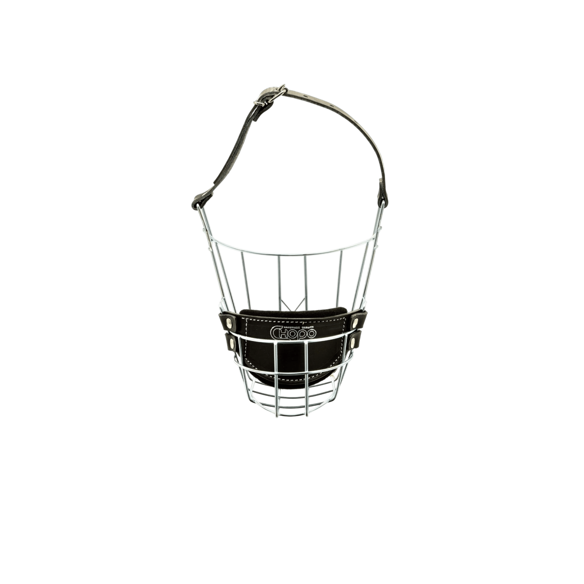 Náhubek se zinkovou povrchovou úpravou. Upínací řemínky jsou vyrobeny z kůže v černé barvě.