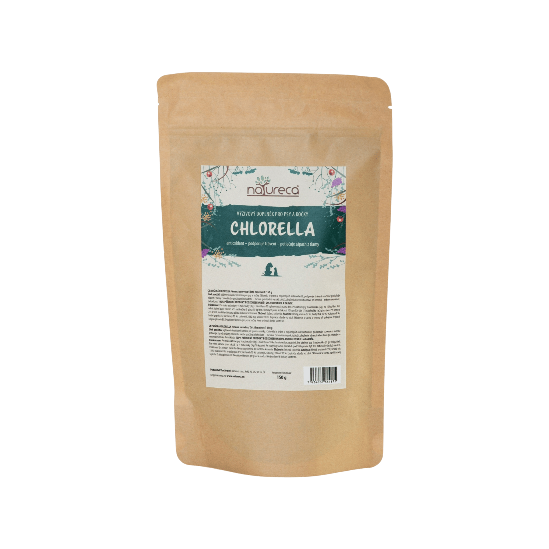 Účel použití: Výživový doplněk krmiva pro psy i kočky. Chlorella je jeden z nejsilnějších antioxidantů, podporuje trávení a účinně potlačuje zápach z tlamy. Chlorellu lze používat dlouhodobě – měsíce (pravidelná vysoká zátěž), zlepšení zdravotního stavu po nemoci - rekonvalescence, detoxikace.