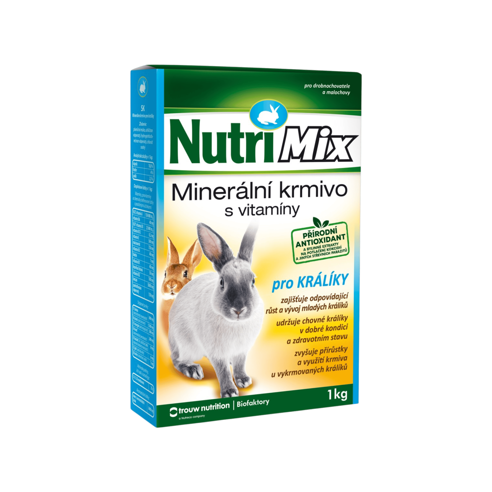 Nutrimix pro králíky je určen pro doplňování krmných dávek všech kategorií králíků. Obsah nezbytných biologicky účinných látek zvyšuje přírůstky hmotnosti a zlepšuje využití přijatého krmiva.