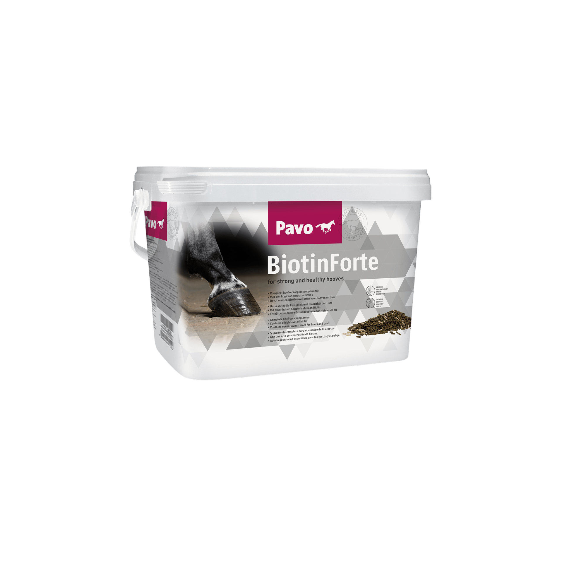 Pavo BiotinForte obsahuje biotin (vitamín B8), měď, zinek a podstatné aminokyseliny pro podporu optimální kvality rohoviny. Výzkum prokázal, že řádná kombinace těchto látek je účinnější, než jen vysoká dávka biotinu. V Pavo BiotinForte jsou tyto poměry v dokonalé rovnováze. Tak vašemu koni dáváte optimální podporu s pomocí pouze jednoho výrobku. Užitkem navíc je kladný účinek na kvalitu srsti, jelikož srst je tvořena ze stejných stavebních kamenů jako rohovina. Srst vašeho koně získá ohromující lesk. Vitamín B8 je nezbytný pro vývoj a zachování vazeb a pojivových tkání v těle, které musí být protahovány a napínány a musí odolat velkému tlaku. Proto Pavo BiotinForte nabízí také stavební kameny pro klouby a cévy. Pavo BiotinForte neobsahuje pšenici,a tak je tento doplněk vhodný i pro koně citlivé na lepek.