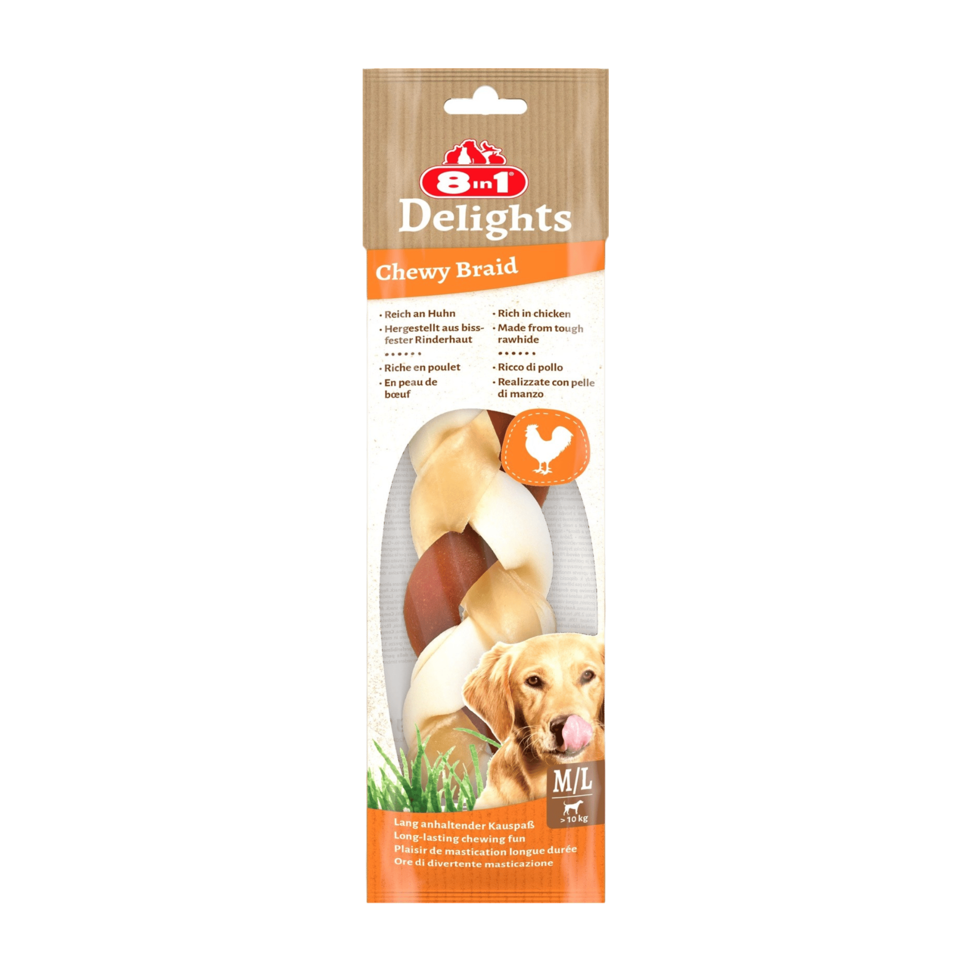 8in1 Delights Chewy Braid je vyrobený z lahodné hovězí kůže, díky které je mimořádně pevný a z kuřecího masa, díky kterému je mimořádně chutný. Vše je propleteno tak, aby vznikl hravý pamlsek, který psi milují. Toto balení Delights Braid obsahuje jeden pamlsek, který dlouho vydrží a je tak ideální pro zabavení vašeho středního nebo velkého psa. Je také skvělý pro zuby a dásně, protože přirozený abrazivní účinek žvýkání pomáhá regulovat tvorbu zubního kamene a plaku na psích zubech. 8in1 Delights Chewy Braid neobsahuje žádná umělá barviva, příchutě ani konzervační látky a žádný přidaný cukr ani GMO. Navíc tento chutný pamlsek pečený v troubě má vysoký obsah bílkovin a nízký obsah tuku, takže svému psovi dopřejete skvělou svačinku.