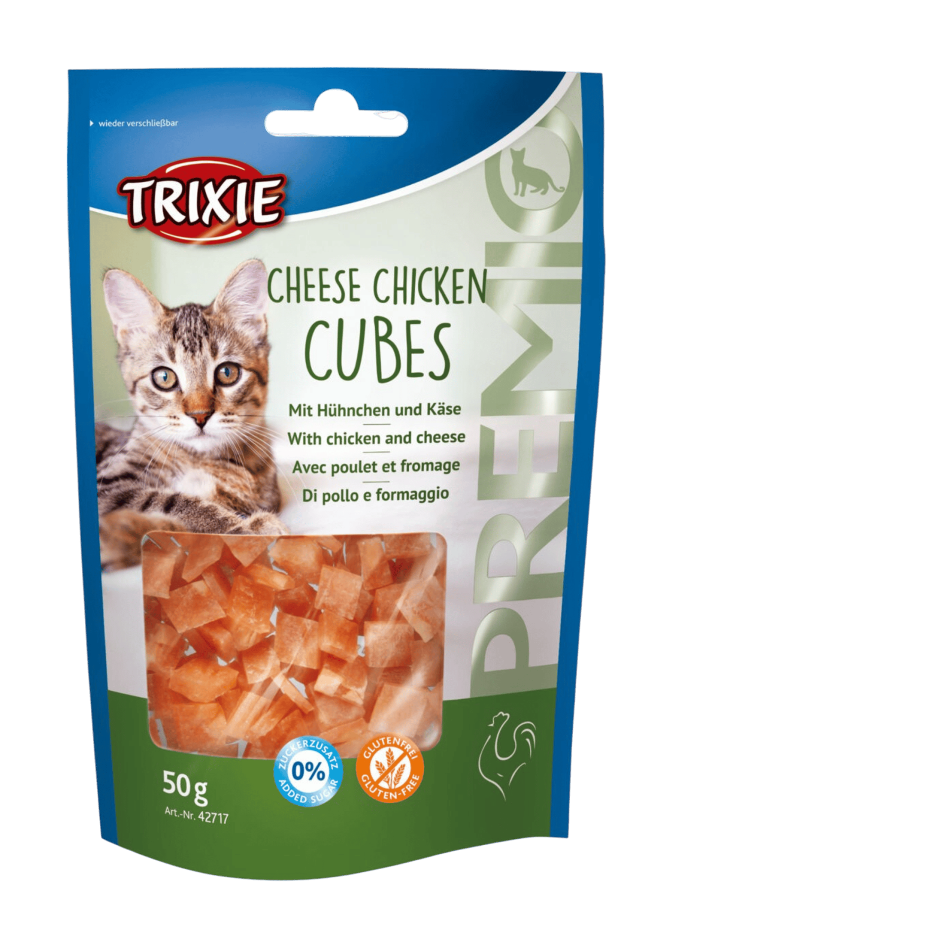 Pochoutka pro kočky, chutný a voňavý pamlsek či odměna pro kočku, kuřecí kostičky se sýrem.
