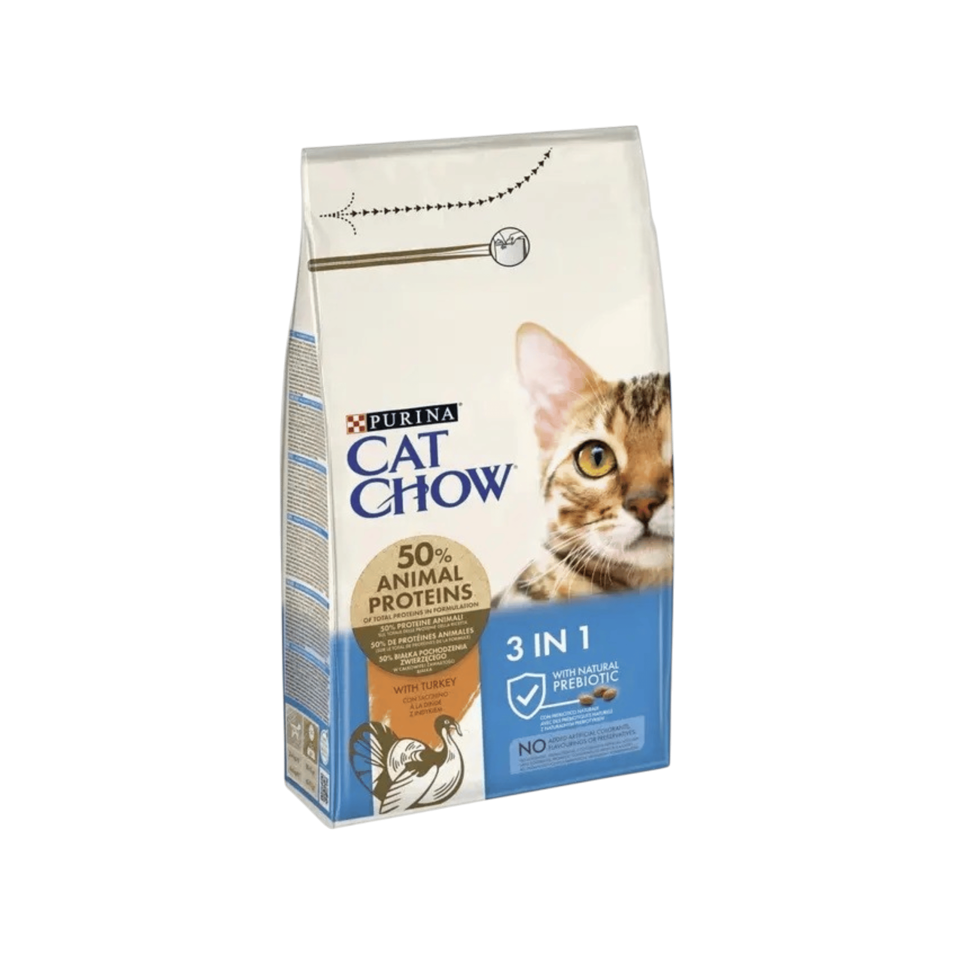 Cat Chow 3 in 1 s krůtím masem je nová receptura s třemi benefity – prokazatelně snižuje tvorbu zubního kamene až o 40%, vyvážený poměr minerálů pro zdraví močových cest a specifický obsah vlákniny, která omezuje tvorby smotků chlupů v žaludku a pomáhá jejich průchodu trávicím traktem.