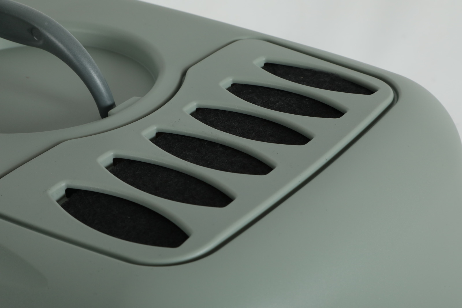 Krytá kočičí toaleta s filtrem a dvířky vyrobená z 50% recyklovaného plastu. Použití recykl. plastu snižuje dopad na životní prostředí o 19%.