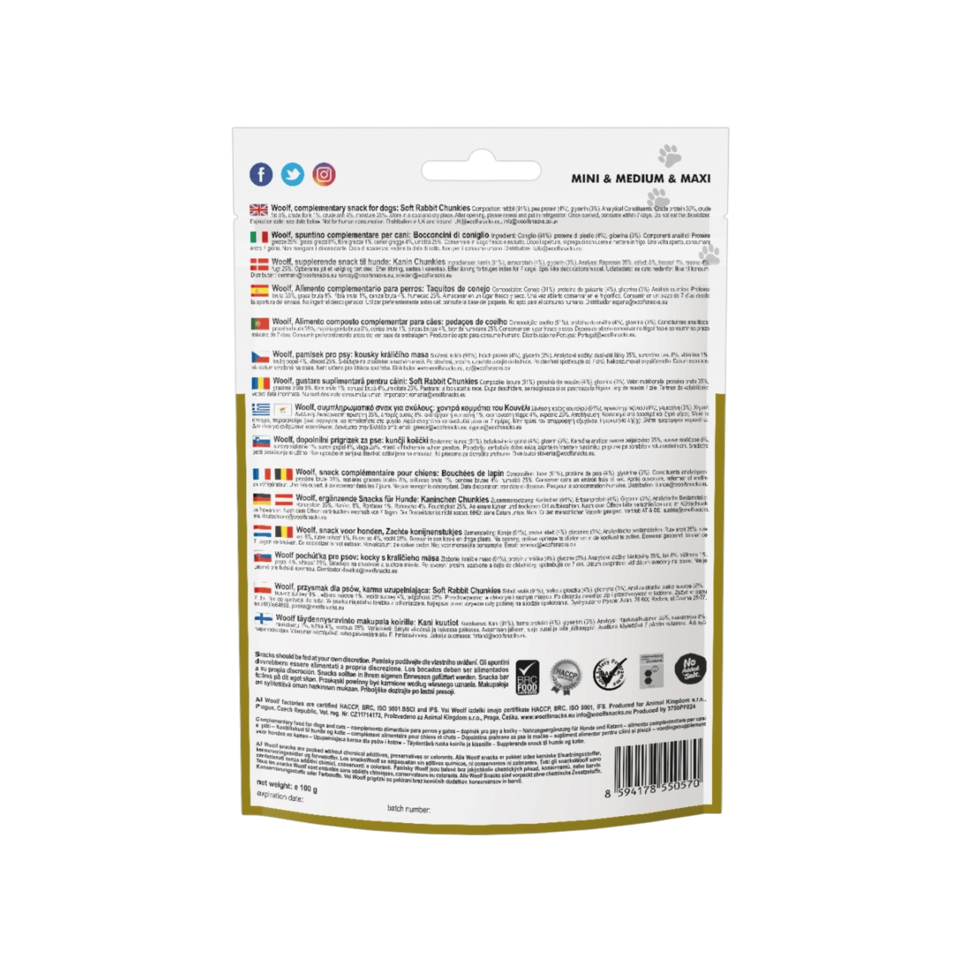 Králičí masový pamlsek ve tvaru malé kostičky nutí i malá plemena ke kousání. Pamlsek je vhodný zejména pro malá plemena psů. Díky králičímu masu je vhodný i pro citlivé a alergické psy. Pochoutky Woolfsnacks jsou speciálně navrženy pro psy všech plemen. Při výrobě jsou ze 100% použity bílkoviny té nejvyšší kvality pro co nejlepší příjem potravy. Veškeré pochoutky Woolfsnacks, jakmile se vyrobí, jsou zabaleny bez chemických přísad, konzervačních látek, nebo barviv. K zajištění ochrany je do sáčku umístěn absorbér kyslíku. Nekonzumovat okysličovadlo.