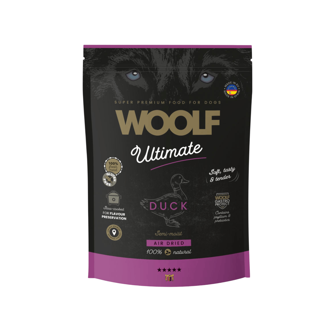 Čerstvá kachna 40 %, čerstvá krůta 35 %, čerstvé ryby 10 %, hydrolyzovaný škrob, glycerin, přírodní antioxidanty (tokoferoly), řepná dužina, kmín, Woolf Gastroprotect (esenciální oleje (hřebíček, tymián, oregano, skořice, rozmarýn), suchý extrakt ze zeleného čaje, ß-glukany a mannan-oligosacharidy (MOS) extrahované ze Saccharomyces cerevisiae), pufrovaný ocet.